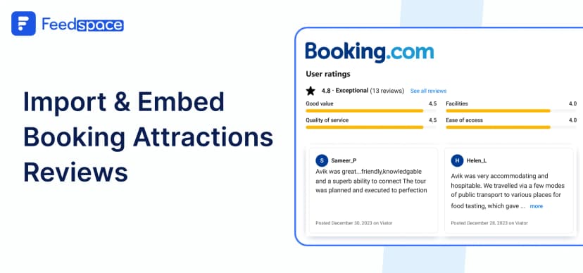 Feedspace is a tool designed to help you gather, organize, and display customer feedback beautifully on your website. Whether you’re running a hotel, a tour company, or any service listed on Booking.com Attractions, Feedspace makes it a easy to import and showcase reviews.