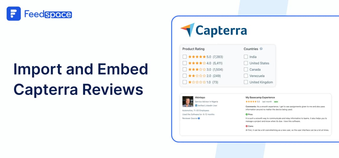 If you’re looking for a quick and no-fuss way to import and show Capterra reviews on your site, Feedspace makes it super easy. Within minutes, you’ll have a dynamic review wall that can instantly boost your credibility.