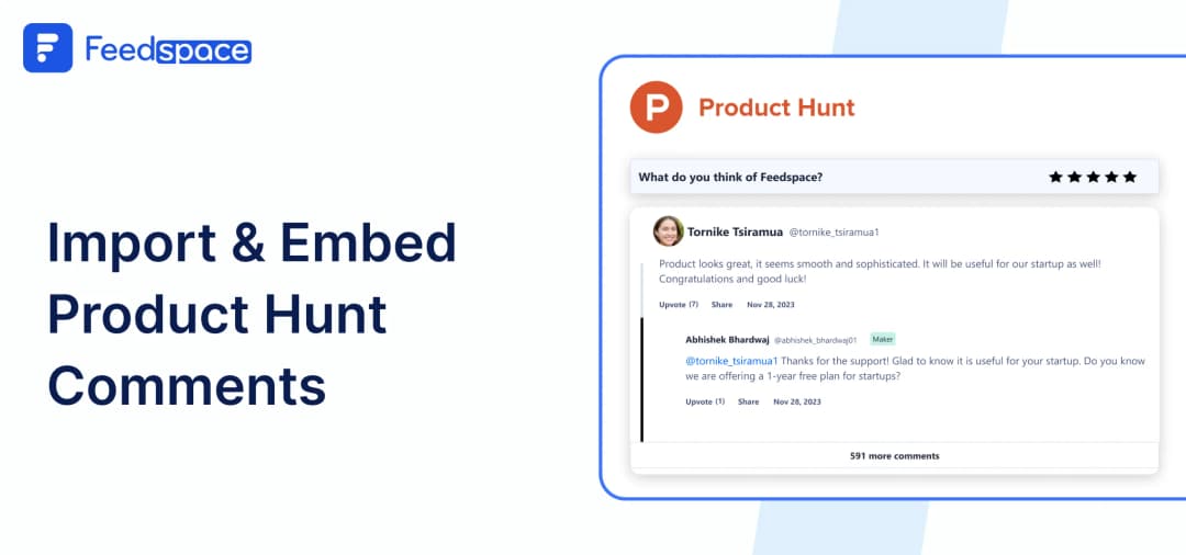 Feedspace is a tool for collecting and displaying feedback from different platforms, like Product Hunt. Using Feedspace , you can fetch, select, and display these comments on your website in just a few clicks.