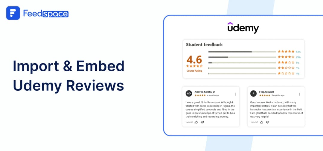 Importing Udemy reviews and displaying them on your website is a great strategy to build credibility and attract new students. Feedspace lets you do this very easily through a customizable Wall Of Love, ensuring you own your reviews forever. Sign up and start importing your Udemy reviews today!