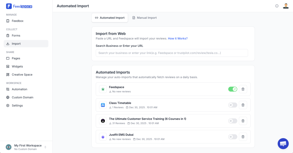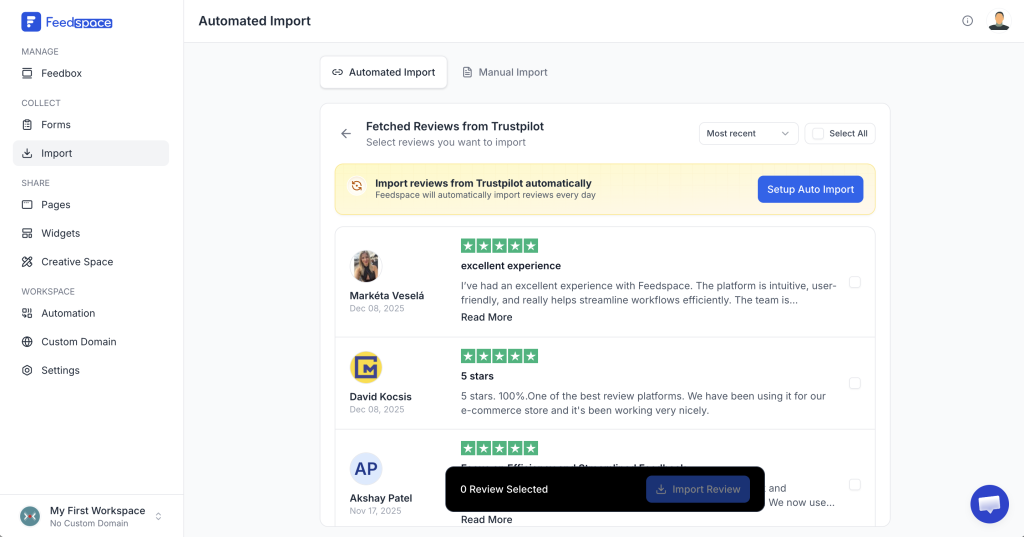 Overview If you have multiple reviews saved in a spreadsheet, Feedspace allows you to import them all at once using the Bulk Import feature. This makes it quick and easy to upload reviews in bulk instead of adding them one by one. Step 1 – Navigate to Bulk Import Step...