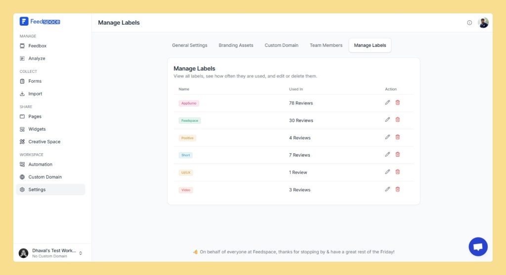 Feedspace allows you to manage your review labels at the workspace level. This includes options to rename and delete existing labels, ensuring that any changes made will apply to all reviews within the workspace that are assigned those labels.