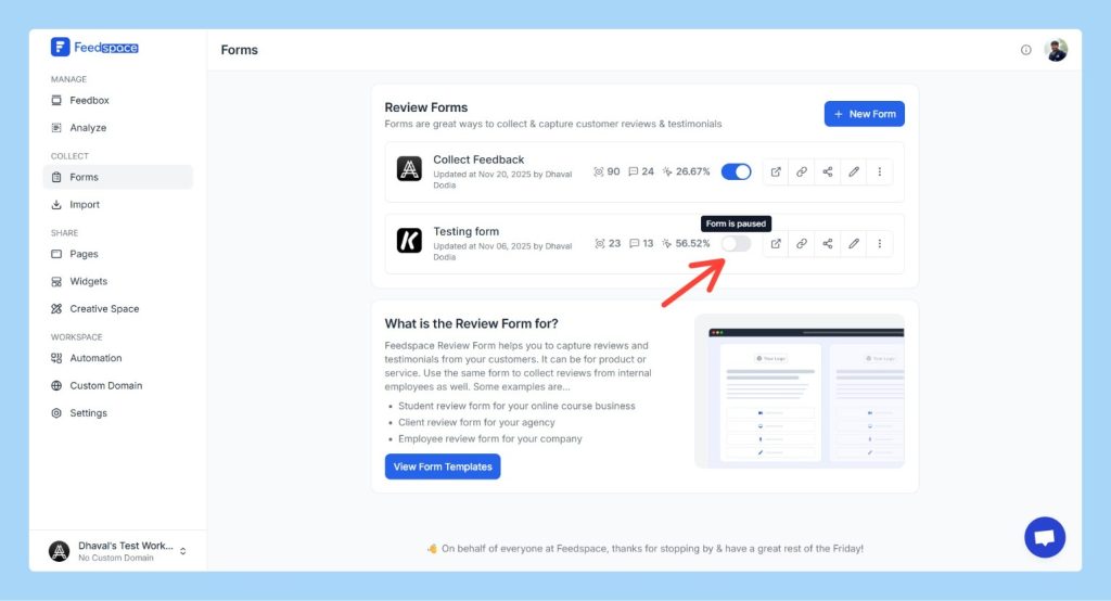 The Pause Form feature in Feedspace allows you to temporarily halt submissions on your Review Form. This can be helpful when you need to stop receiving reviews for a while without deleting the form.